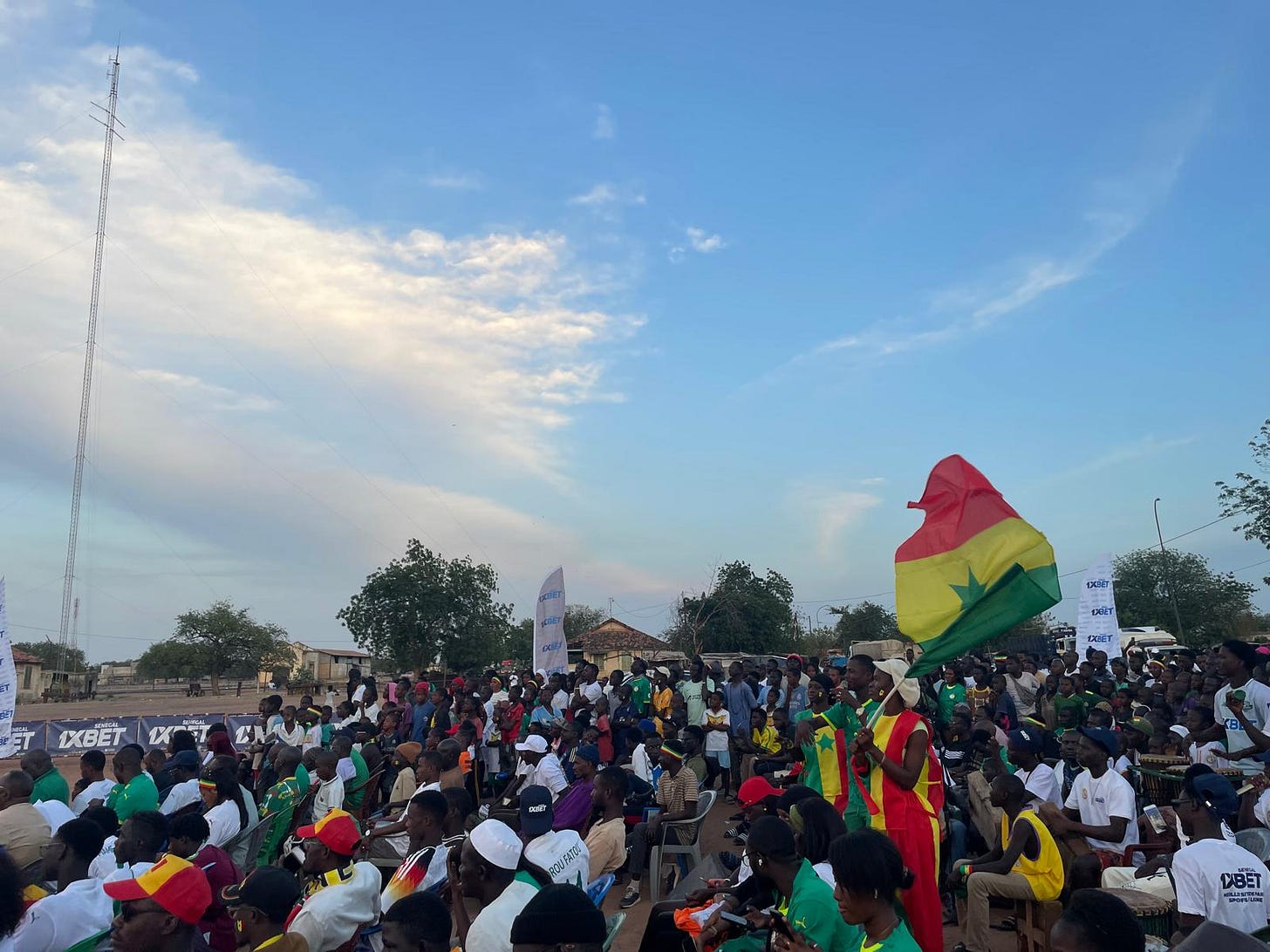 I tamburi li sentiamo solo quando ci avviciniamo all’arena, tanto è il brusio, tanta la gente che corre a destra e sinistra. Quasi veniamo investiti da pazzi in motorino, tektek si susseguono portando la gente a vedere la partita per il costo di 100Cfa. È già una festa dove generazioni si incontrano. Donne con il velo, donne bellissime, uomini a petto nudo e in tenuta serissima con il tipico boubou, messo soltanto per il giorno del signore (il venerdì) ed eventi importanti, come la finale della CAN.